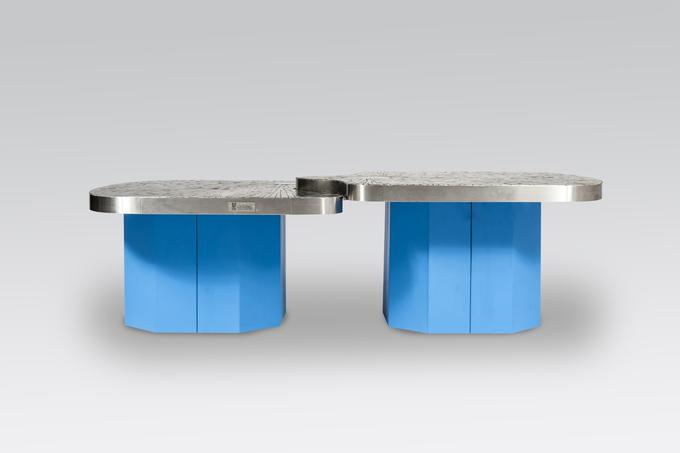 Created to measure by Stan Usel, this 2 in 1 coffee table and side table in mosaic stainless steel and blue agates gemstone. Do not hesitate to ask us the different models, already executed. Form Exceptional craftsmanship with the art of tailor made furniture. This original and unique pieces are signed by the artist and comes with the certificate of authenticity.All pieces can be custom-made to order. Proudly Belgian.