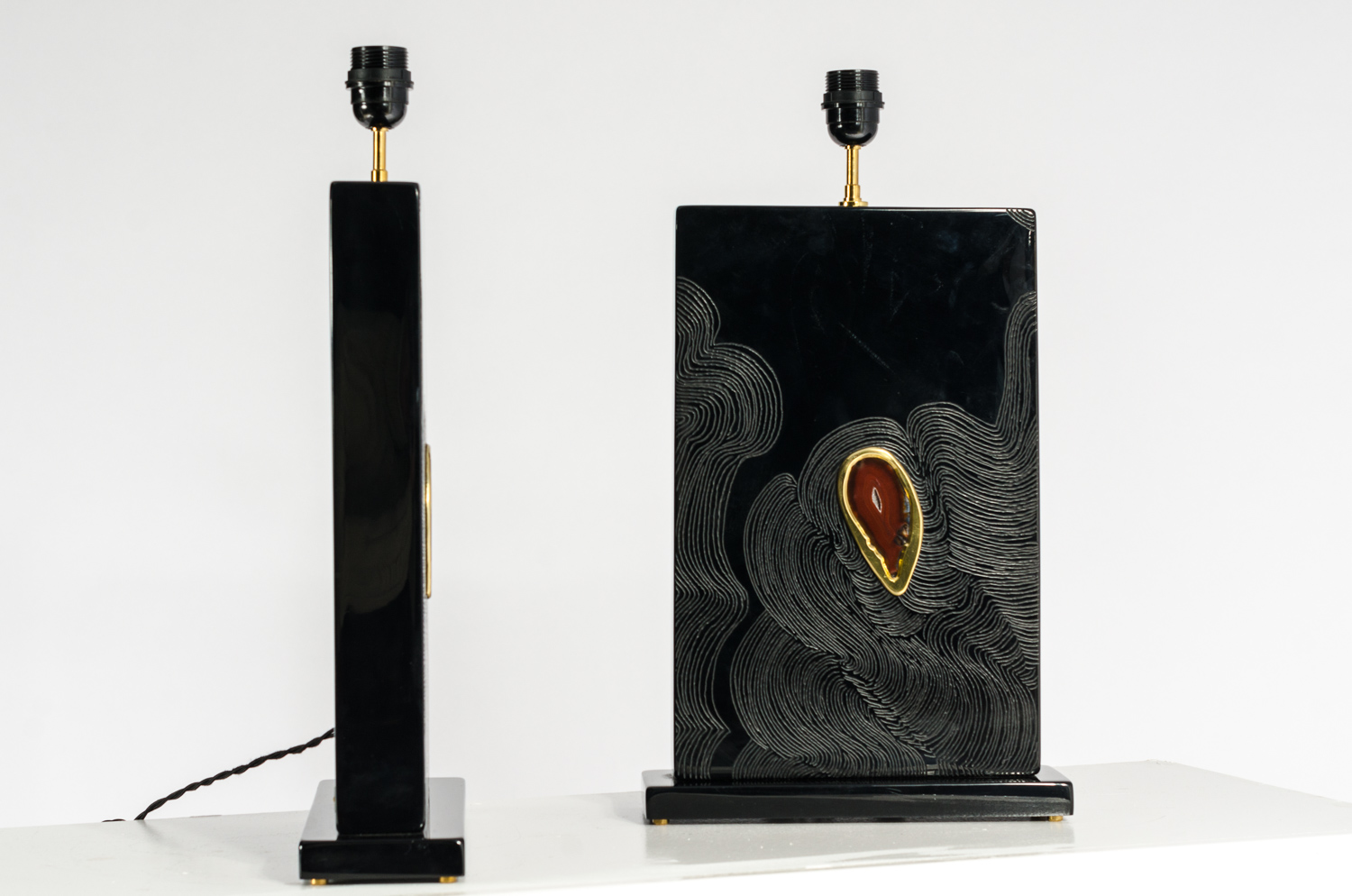 One of a kind studio built Pair of Table Lamps in black resin with inlaid agate by Stan Usel.