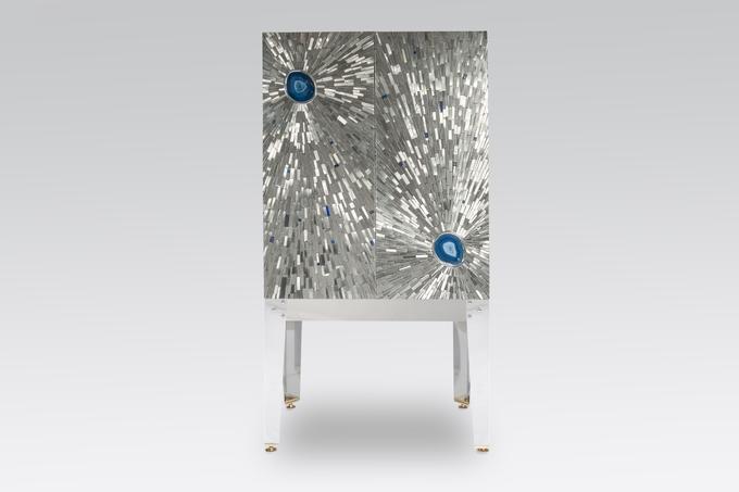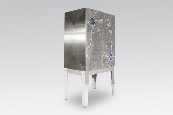 Created to measure by Stan Usel, this cabinet of stainless steel and brass is inserted with a magnificent agates stones highlighting a mosaic radiation. Different utility (bar,wardrobe,shelf) Each piece is topped with unique stones and is discretly designed to offer the ultimate connectivity for your needs. Exceptional craftsmanship with the art of tailor made furniture. This original and unique piece is signed by the artist and comes with a certificate of authenticity.All pieces can be custom-made to order. Proudly Belgian.
