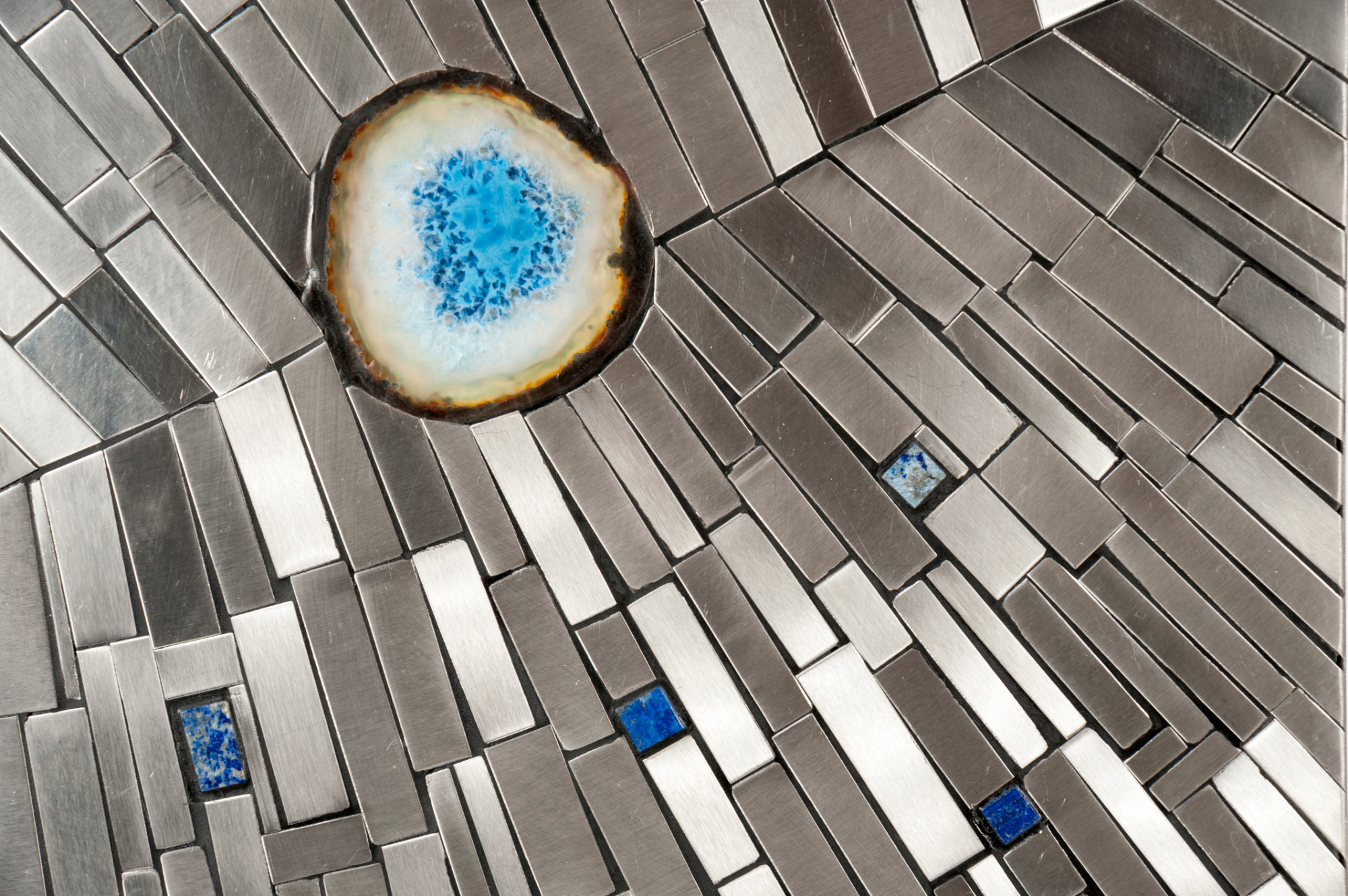 Created to measure by Stan Usel, this pair detail of stainless steel, table lamps topped with a magnificent lapis lazuli and agates gemstone highlighting a mosaic radiation. Each piece is topped with a unique stone and when put together aside gives a great sense of harmony. Exceptional craftsmanship with the art of tailor made furniture. This original and unique pieces are signed by the artist and comes with the certificat of authenticity.All pieces can be custom-made to order. Proudly Belgian.